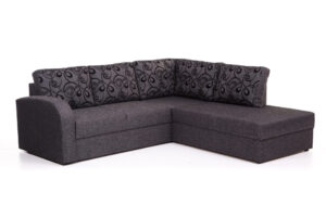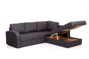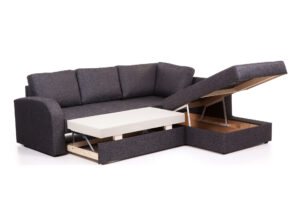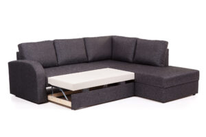 - The corner sofa bed has a pull-out bed mechanism and a large laundry box